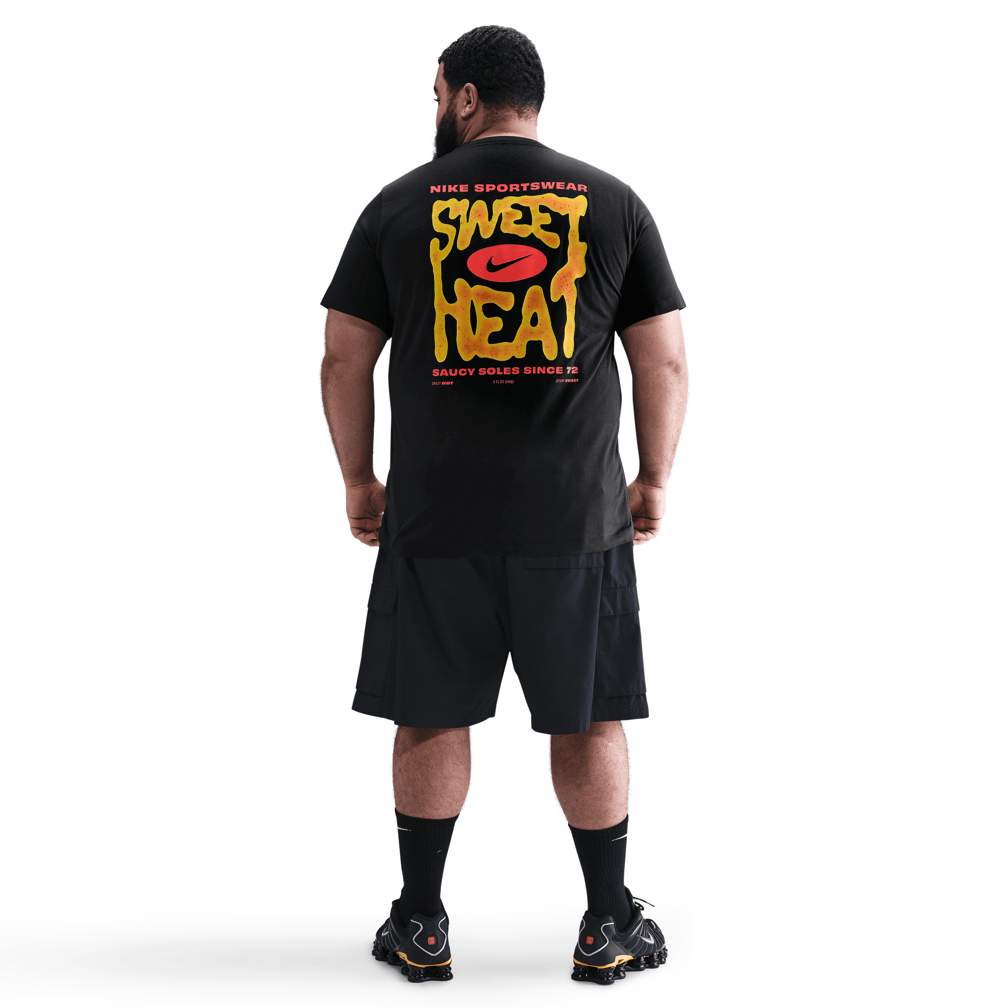 Turn up the style with the Nike Sportswear Sweet Heat T-Shirt. Made from soft, breathable cotton, this tee delivers all-day comfort with a bold, eye-catching design. The front features a small hot sauce bottle graphic dripping in signature Nike flavor, while the back explodes with oversized "Sweet Heat" lettering in fiery yellow and red, complete with the iconic Swoosh. Perfect for pairing with your favorite Nike kicks, this shirt celebrates “Saucy Soles Since ’72” and brings a streetwear-ready edge to your look.